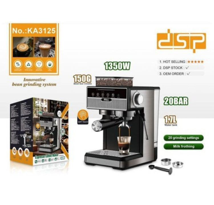 نوع: اسپرسو ساز برند: دی اس پی مدل: KA3125 منبع تغذیه: برق ولتاژ: 220 الی 240 ولت توان مصرفی: 1350 وات فشار بخار: 20 بار ظرفیت مخزن آب: 1.7 لیتر آسیاب سرخود: دارد ظرفیت آسیاب: 150 وات تعداد سرعت آسیاب: 20 عدد مخزن آب قابل جابه جایی: دارد قابلیت تولید کف شیر: دارد تعداد نازل قهوه: 2 عدد هشدار صوتی: دارد سیستم کاپوچینو ساز: دارد سینی چکه گیر: دارد کنترل پنل: لمسی جنس بدنه اسپرسو ساز: استیل ضد زنگ و پلاستیک حفاظت در برابر گرمای بیش از حد رنگ اسپرسو ساز: ترکیب نقره ای و مشکی شستشو آسان: دارد